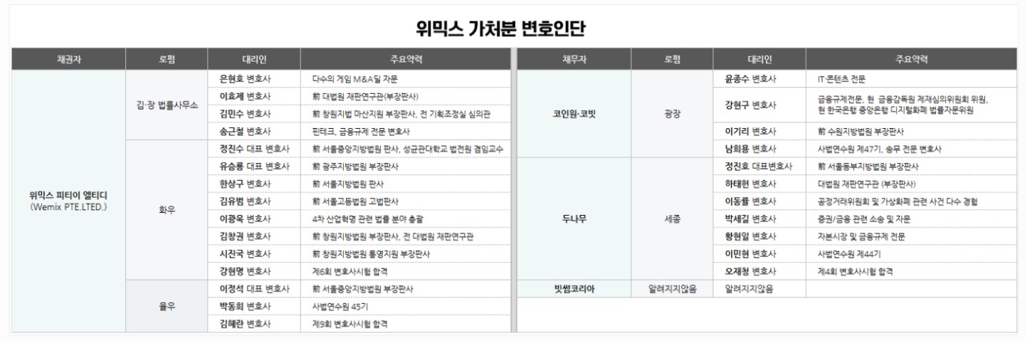 12월 2일 위메이드의 암호화폐인 '위믹스'의 거래 지원 종료에 대하여 서울중앙지방법원에서 실시했습니다. 위메이드측의 가처분 변호인단은 김앤장으로서 편성이 되어서 변호를 했습니다. 반면 두나무의 로펌은 세종으로 알려져 있습니다.