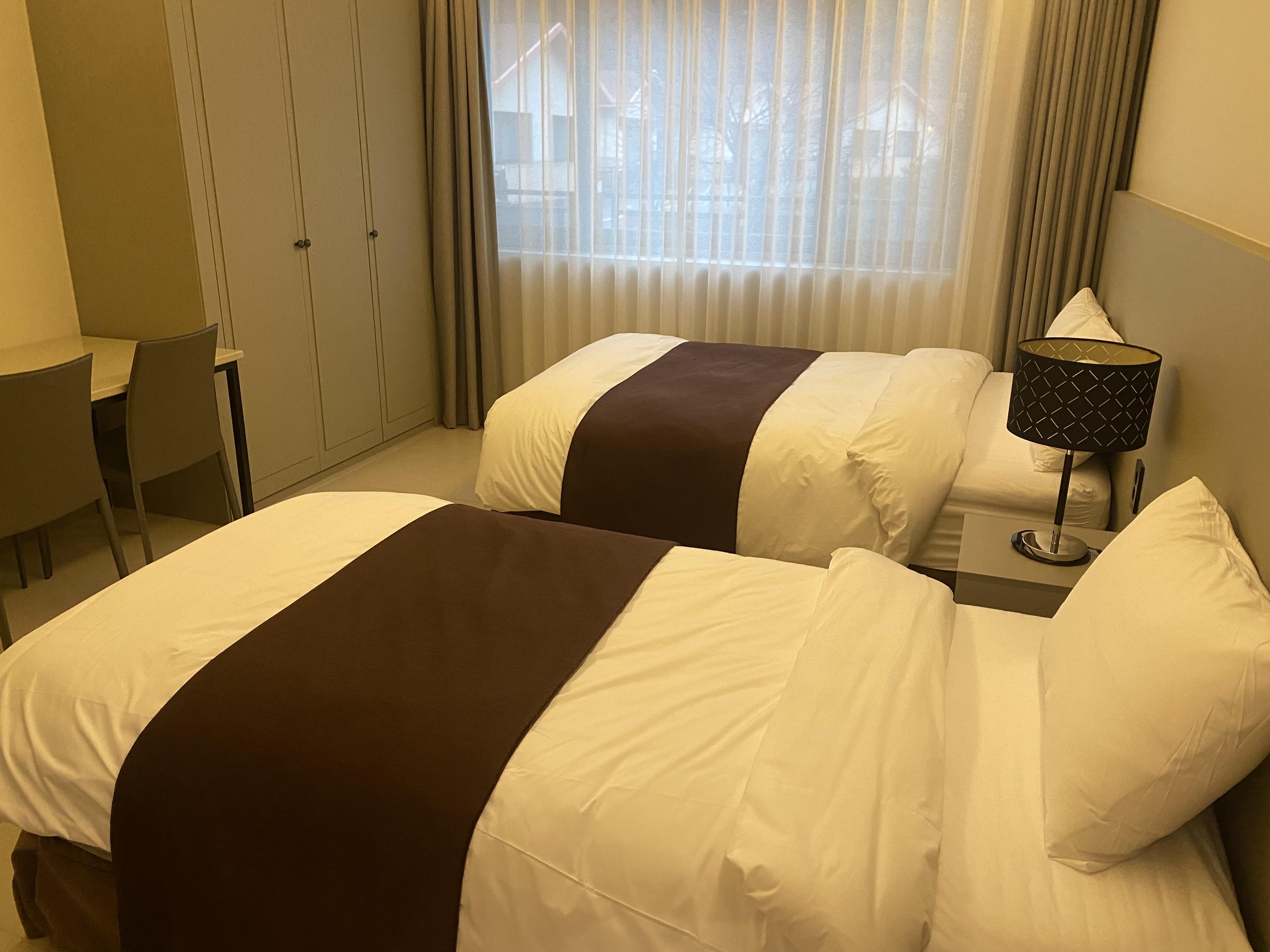 침대는 총 싱글베드 4개, 더블베드 2개로 총 6명이 침대에서 잘 수 있었습니다. 하지만 저희는 총 7명에서 객실을 이용해야 했기 때문에 한 명은 바닥에서 자게 되었습니다.