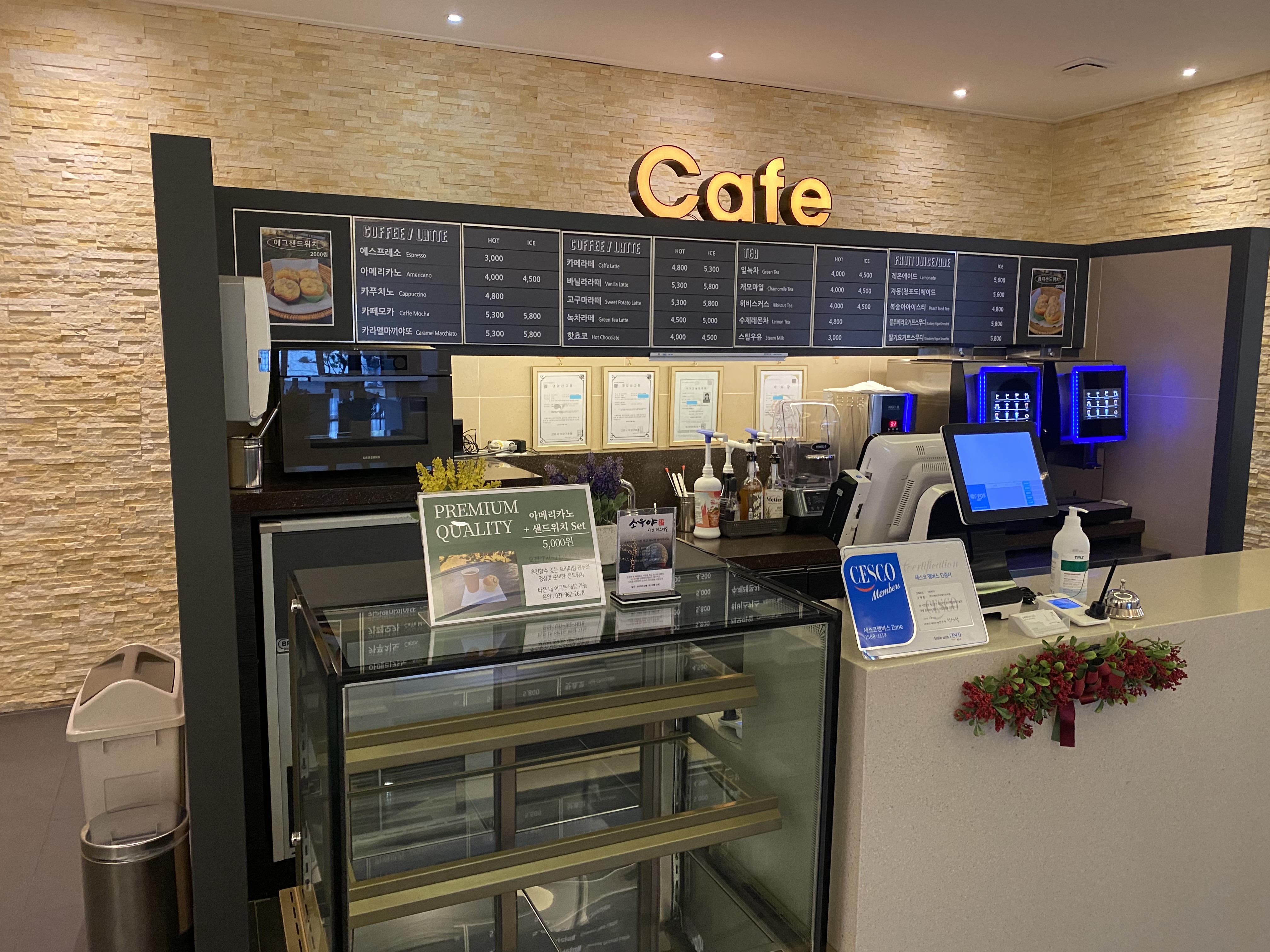 카페도 마련되어 있어서 커피나 차를 마실수 있습니다. 커피맛은 그저 그랬던 거 같습니다.