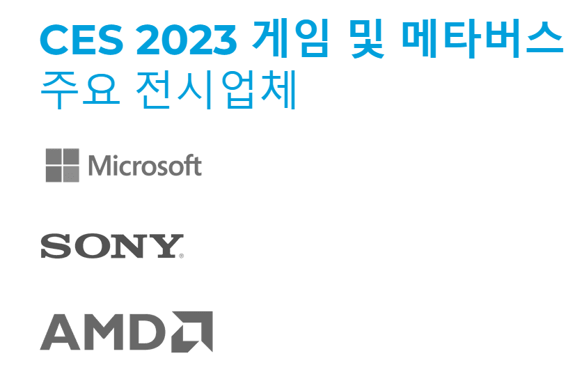 CES 2023 게임 및 메타버스 주요 전시업체로는 마이크로소프트, 소니, AMD가 참여할 것으로 기대가 되고 있습니다. 마이크로소프트는 블리자드를 인수하면서 게임쪽으로 관심을 가지고 있어서, 이번 전시를 통해서 어떤 기술을 보여줄지 기대가 됩니다.