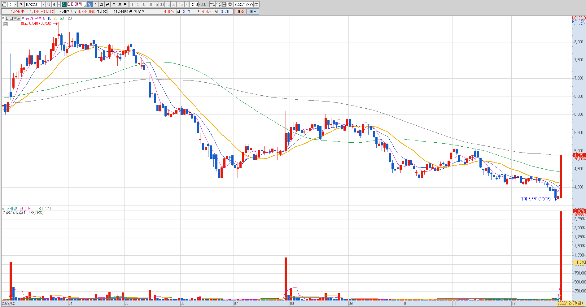 디티앤씨 일봉차트를 보시면 바닥권에서 거래대금과 함께 상한가로 마감을 했습니다. 2시쯤 상한가로 마감을 하여서 풀린 적이 없고, 아직 재료가 살아있으므로 기대가 되는 종목입니다.