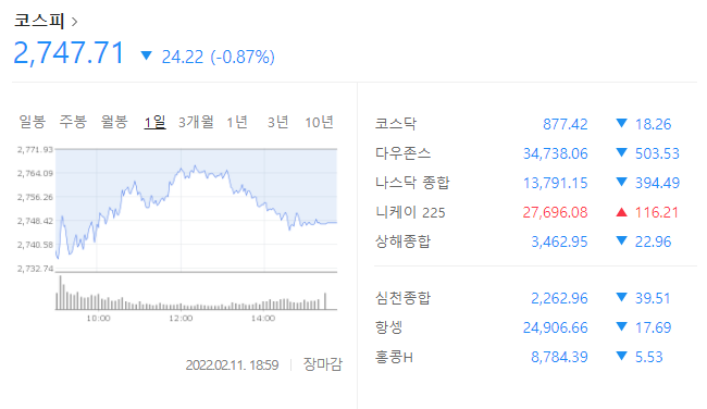 2/11 금요일 코스피 시장도 -0.87% 떨어진 가운데