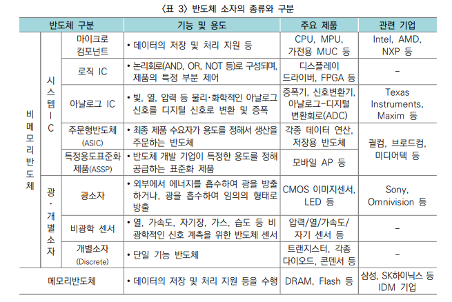 “비메모리반도체”는 엄격히 시스템반도체와 광・개별소자로 구분하나, 일반적으로 비메모리반도체와 시스템반도체를 유사한 개념으로 사용 l 반도체 소자의 설계・제조 산업은 소자의 용도에 따라 데이터 저장에 특화된 “메모리반도체”와 연산・제어 등 정보처리 기능을 갖는 “시스템반도체”로 구분 - 메모리반도체는 자료 저장 방식에 따라 휘발성(DRAM 등) 및 비휘발성 메모리(NAND Flash 등)로 크게 구분 제1장 개요 3 - 시스템반도체는 비메모리반도체의 일종으로 광・개별소자 등을 뺀 나머지 분류에 대해 기능에 따라 크게 마이크로컴포넌트, 로직IC, 아날로그IC 등으로 구분