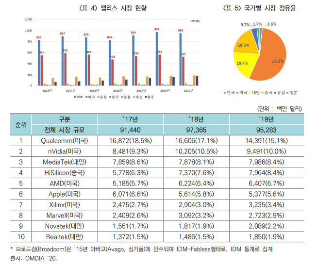 - 미국은 Qualcomm, nVidia, AMD 등 세계 10대 팹리스 기업 6개를 보유하고 있는 강국이며, 높은 시장점유율을 유지