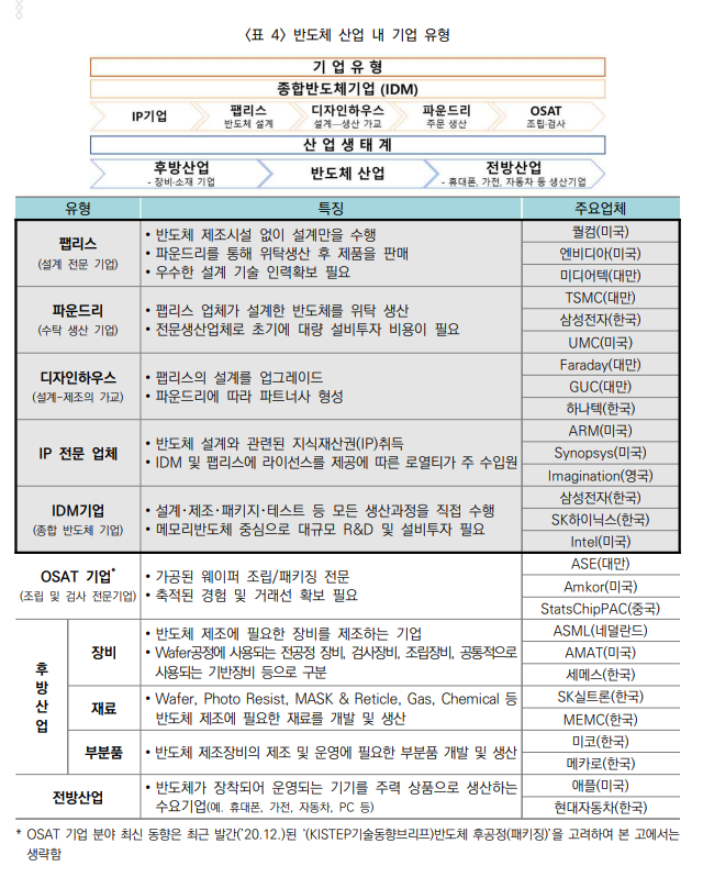 시스템반도체 산업은 일반적으로 설계(팹리스)와 생산(파운드리)으로 분업화되어있으며, 설계・생산을 함께 수행 가능한 종합반도체(IDM)기업이 일부 존재