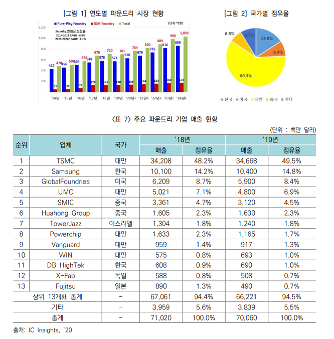 - 대만의 TSMC가 세계시장의 49.5%를 점유하고(1위) 있으며, 국내 기업으로는 삼성전자가 14.8%로 2위, DB하이텍이 1.0%로 11위에 위치