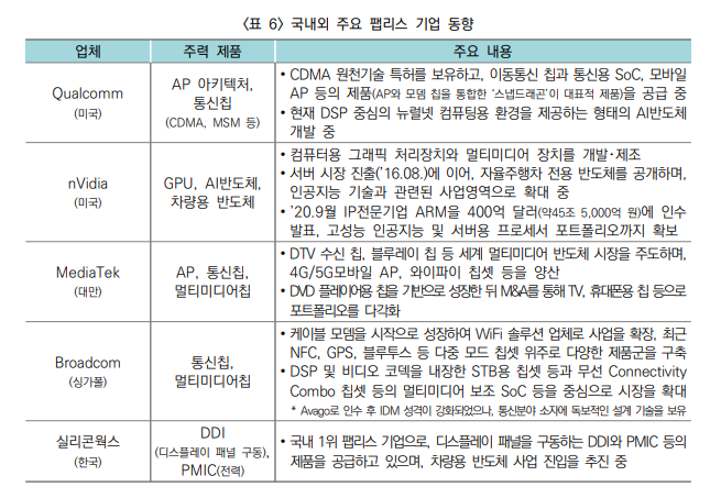 *국내 매출 1위 기업인 실리콘웍스는 7억 달러의 매출을 보유하고 있으나, 주요 팹리스 기업에 비하면 매출액 저조(세계 16위)