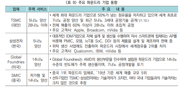 - 다만, 최근에는 국내 팹리스 기업이 국내 파운드리를 적극 활용 추세로 알려짐
