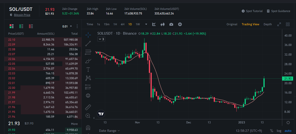 앞서 솔라나의 폭락한 이유는 FTX 거래소 파산사태에 영향을 미쳤던 바가 있습니다. 하지만 이번 미국 파산법원의 FTX 핵심거래소 매각을 승인하면서 불확실성 해소로 인한 상승으로 파악되고 있습니다.
