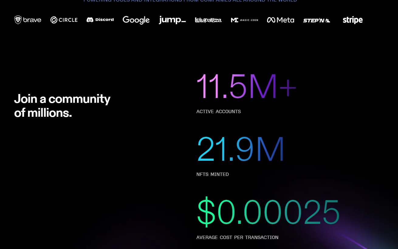 현재 솔라나는 Brave, Circle, Discord, google, jump, 메타, 스테픈, stripe와 같은 기업들이 참여하고 있습니다.