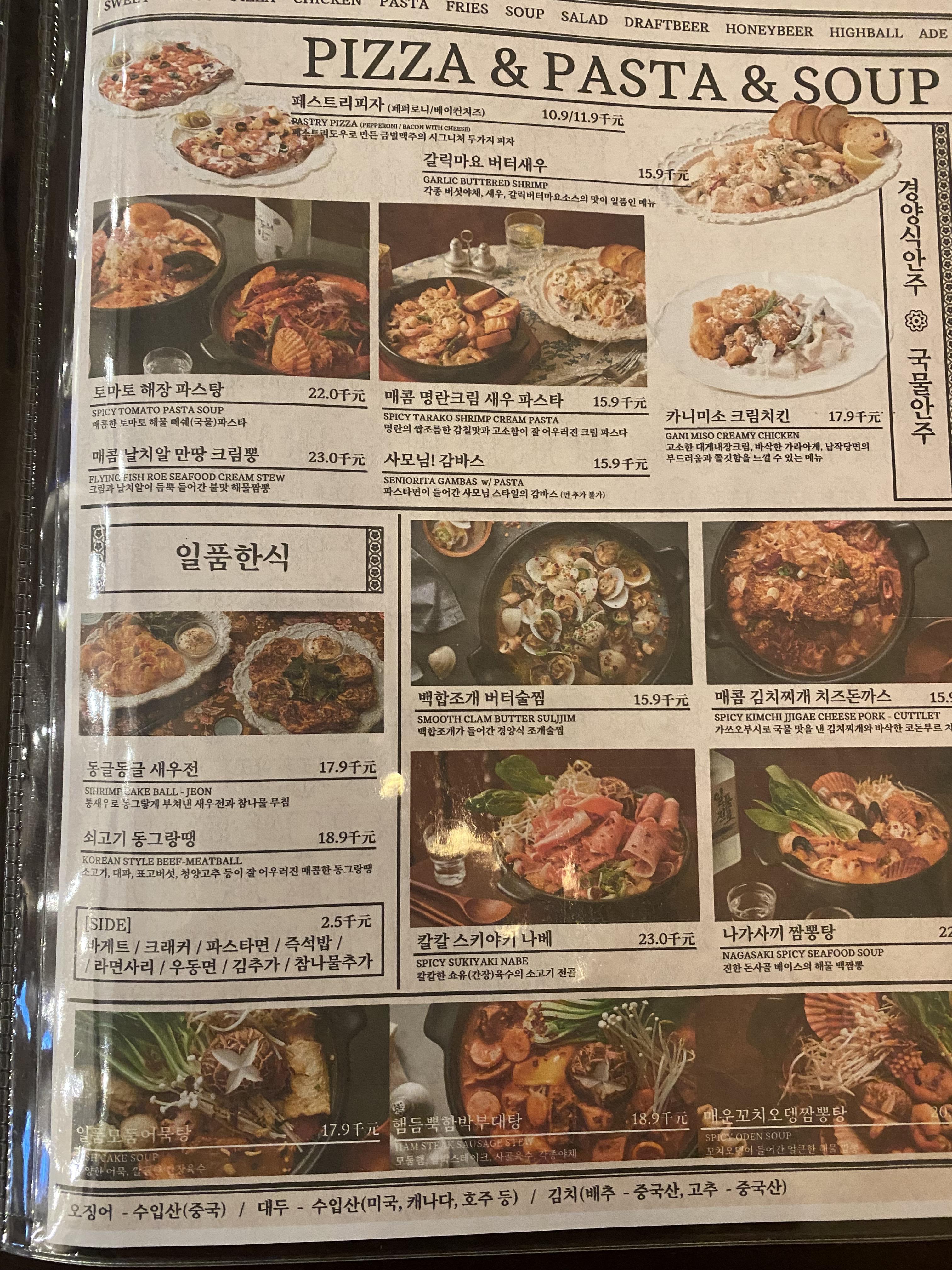 금별맥주의 안주는 경양식 안주, 국물 안주, 일품 한식, 마른안주, 튀긴 안주, 피자, 디저트 등이 있습니다. 저희는 2차로 왔기 때문에 토마토 해장 파스탕와 반통 파인애플, 그리고 갈릭마요 버터새우를 주문했습니다.