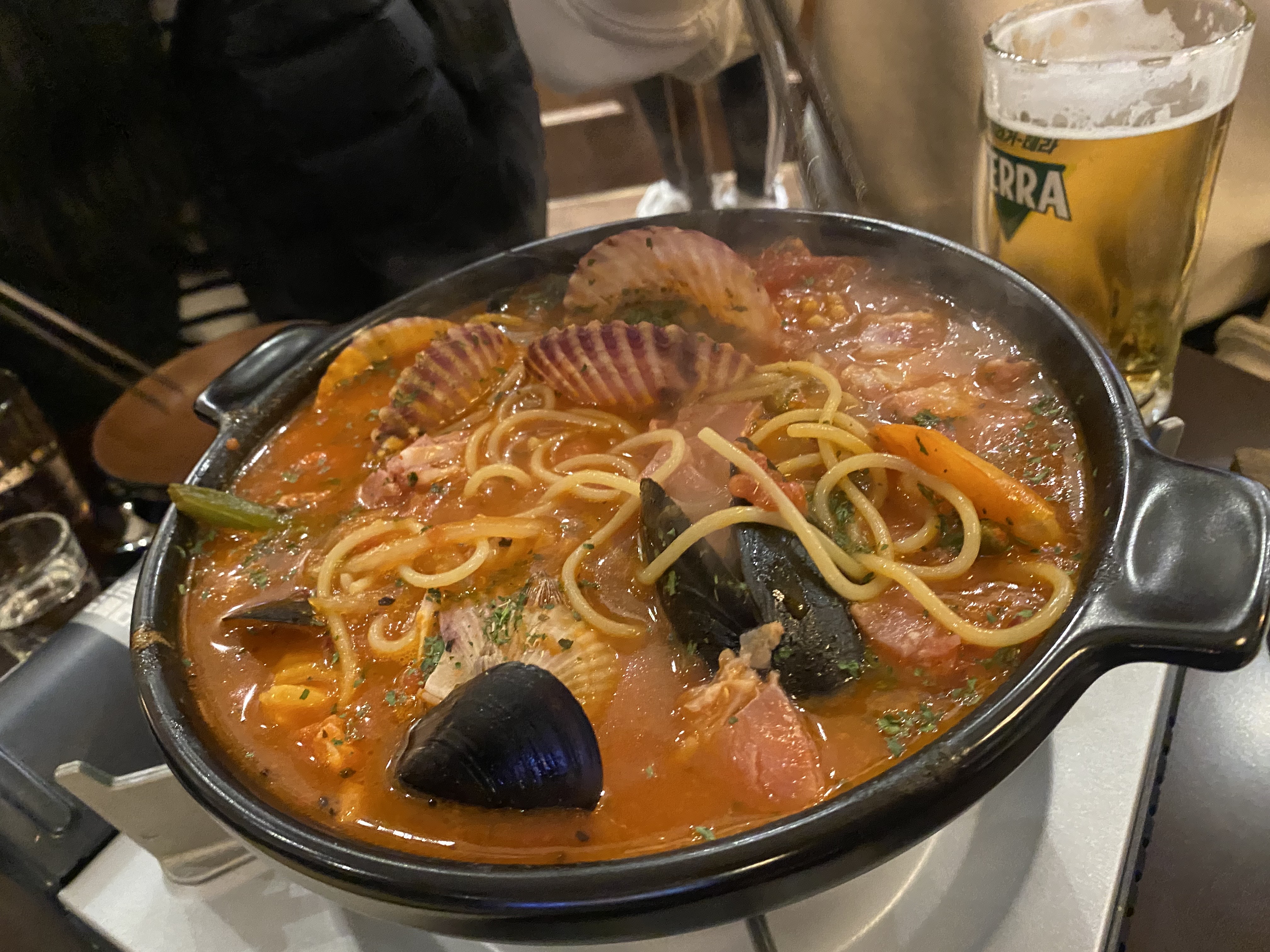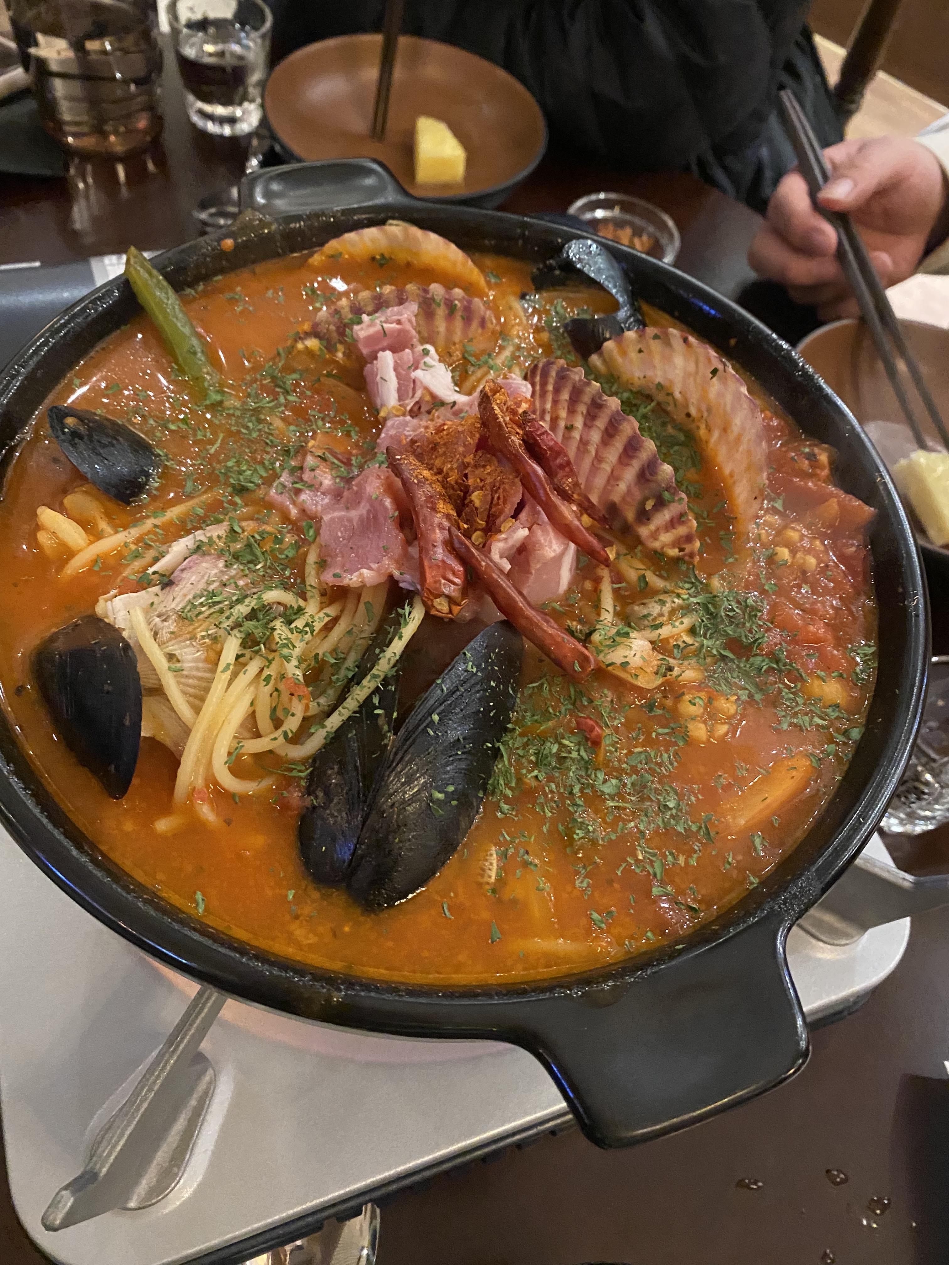 토마토 해장 파스타는 매콤한 토마토 해물 국물 파스타입니다. 조개류와 베이컨, 파스타가 곁들여져서 술을 먹으면서 해장이 가능한 메뉴인거 같아서 주문을 했지만 너무 매워서 많이 먹질 못했습니다. 태국고추가 들어가 있어서 상당히 매웁니다.