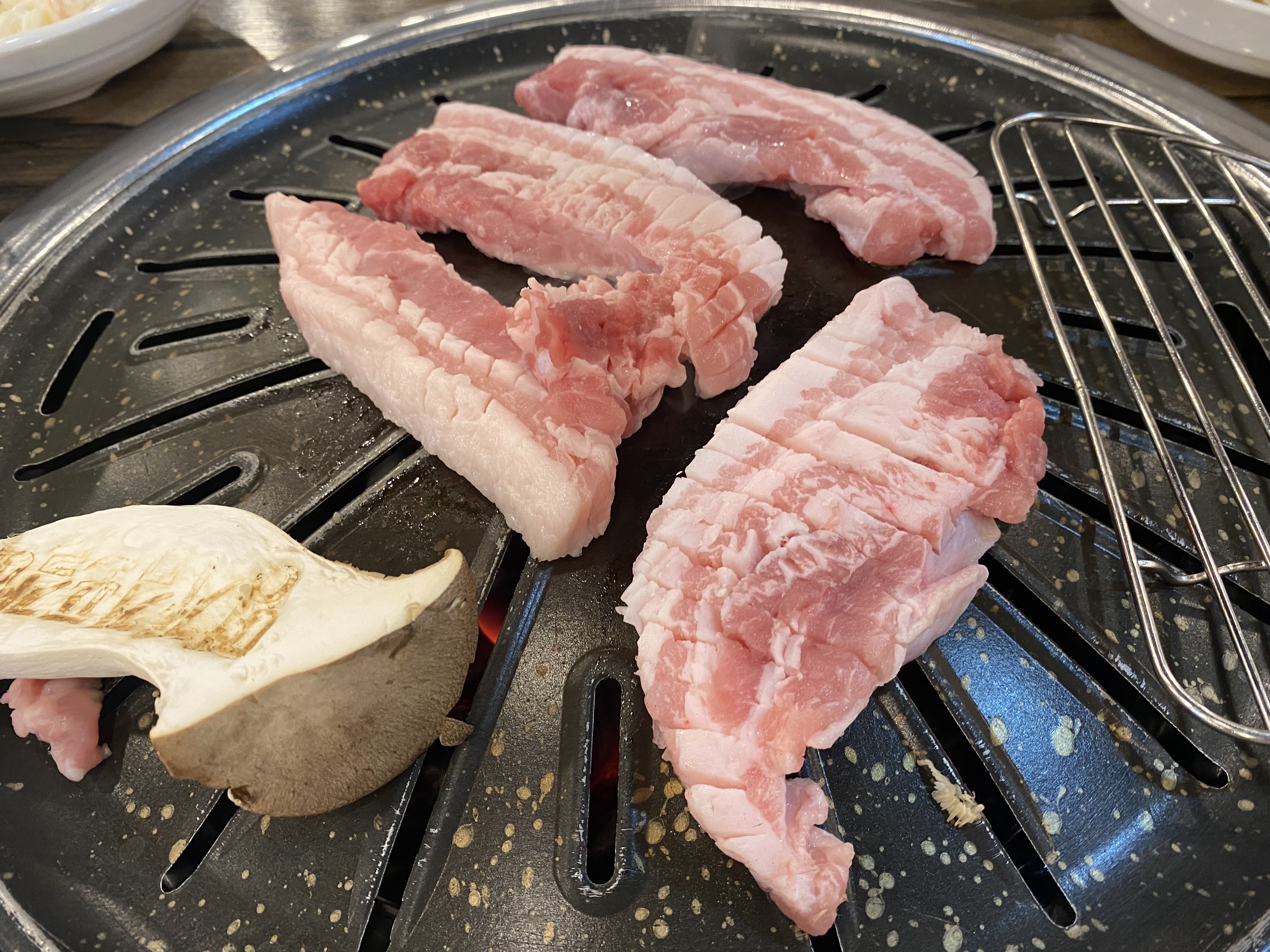 먼저 주문했던 생삼겹살이 나와서 바로 불판에 구웠습니다. 삼겹살 상태가 좋아서 맛있어 보였습니다.