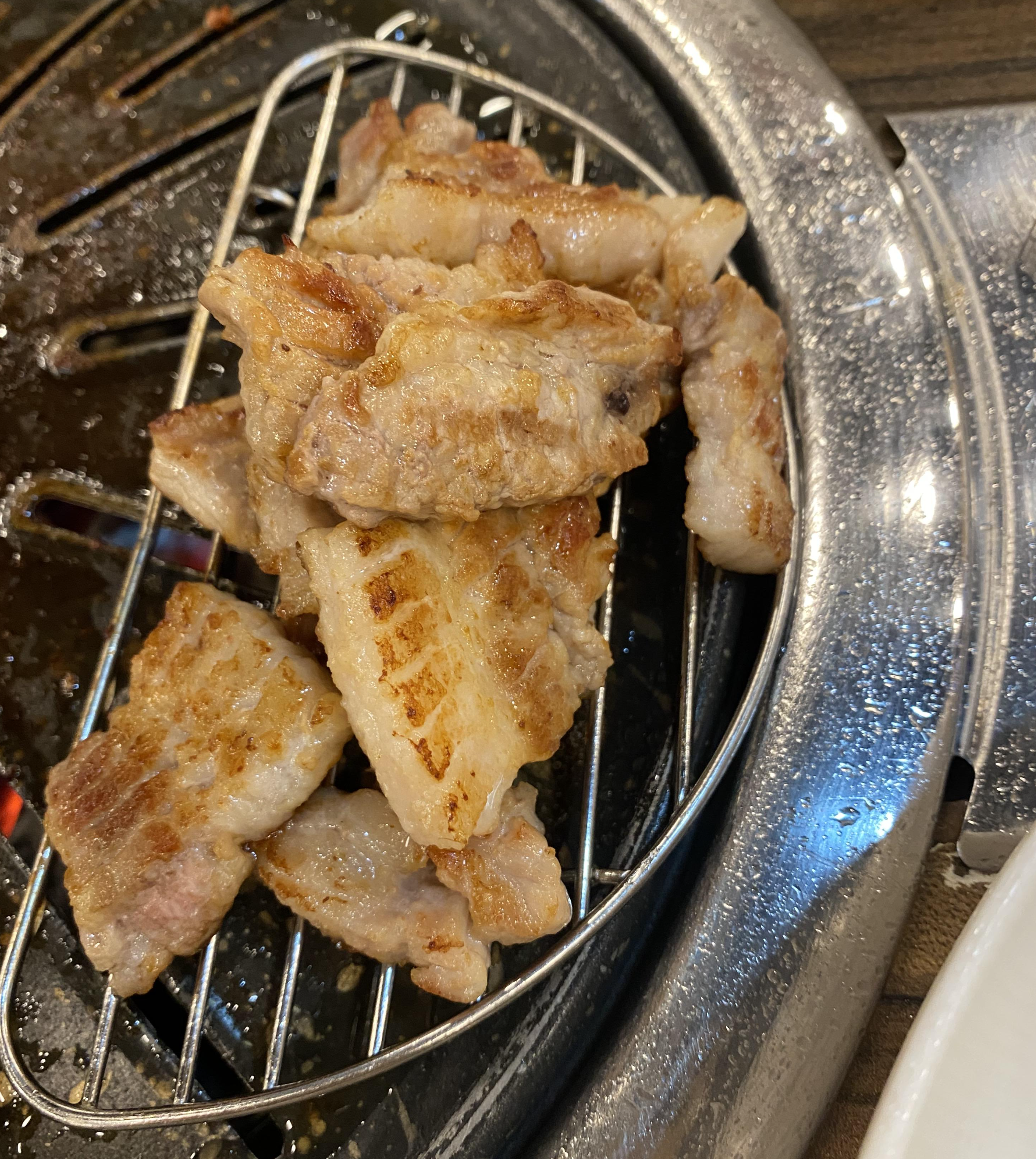 명가 김포 참숯 갈비에서 생삼겹살을 노릇노릇하게 구운 상태입니다. 고기와 쌈장, 명이나물, 상추와 싸 먹으면 맛있습니다.
