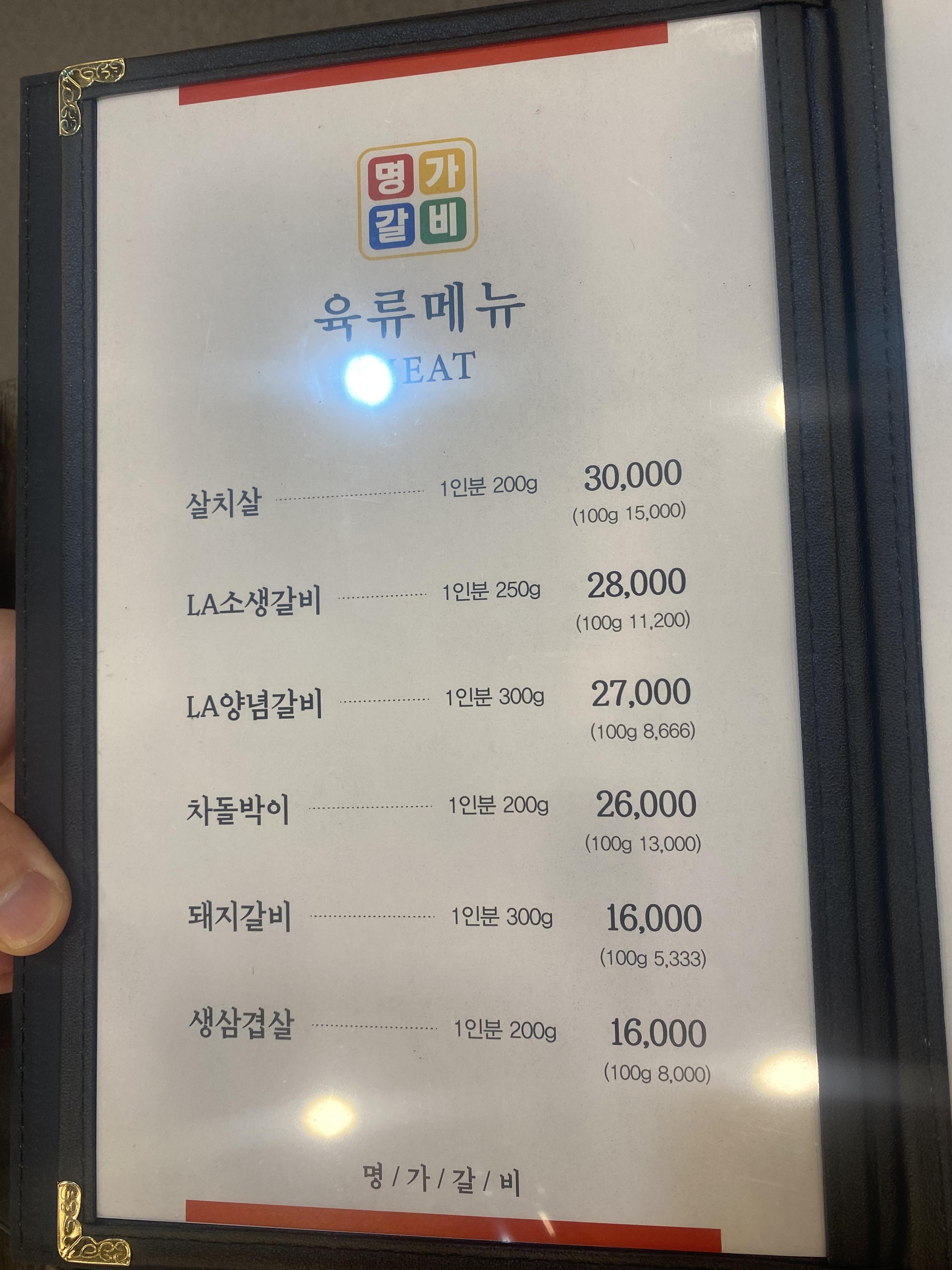 명가 김포 참숯 갈비는 살치살, LA소생갈비, LA양념갈비, 차돌박이, 돼지갈비, 생삼결살을 판매하고 있습니다. 저희는 1차로는 생삼겹살을 먹고 LA양념갈비를 먹기로 했습니다.