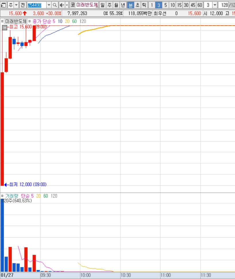 안녕하세요 벨카입니다. 오랜만에 신규상장주가 따상으로 마무리하는 종목이 나왔네요. 그동안 신규상장주의 부진했던 모습과는 다르게 미래반도체는 1/27 상장한 지 30분 만에 상한가로 안착하여 한 번도 안 풀리고 마감했습니다.