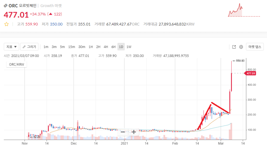 오르빗체인의 일봉차트를 보면 어제의 거래량보다 더 큰 거래량으로