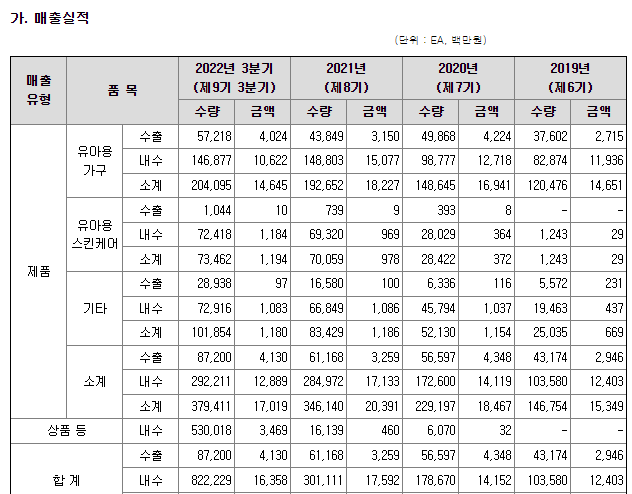 꿈비의 매출실적을 보시면 2019년부터 2022년 3분기까지 성장하는 모습을 보여주고 있습니다. 특히 수출도 함께 우상향 하는 추세이며, 동남아 등의 신규시장을 확장할 계획이라고 합니다. 꿈비는 지난 5년간 연평균 36% 매출액 성장률을 기록 중입니다.