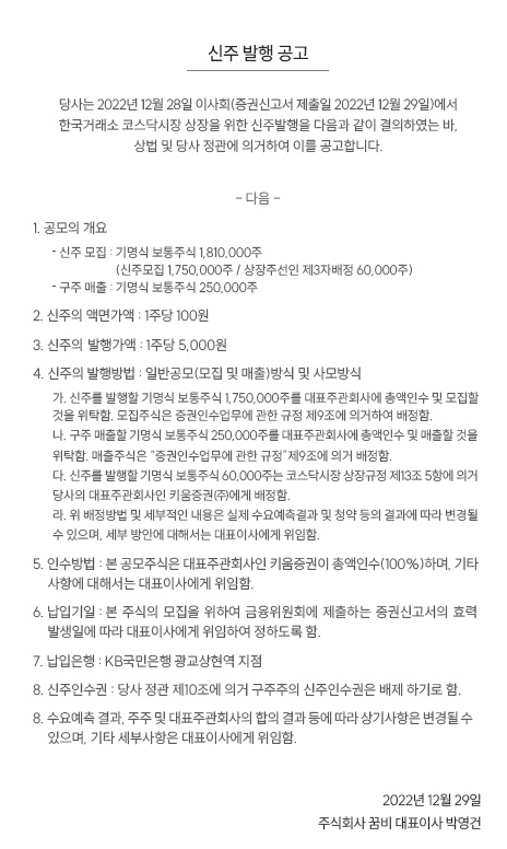 꿈비는 1주당 발행가액을 5,000원이며, 신주는 기명식 보통주식 1,750,000주를 발행하였습니다. 꿈비는 공모주 청약을 해서 경쟁률이 약 1772대 1을 기록하면서 많은 관심을 받았습니다. 청약 증거금만 2조 2천억 원을 모은 것으로 기록되었습니다.