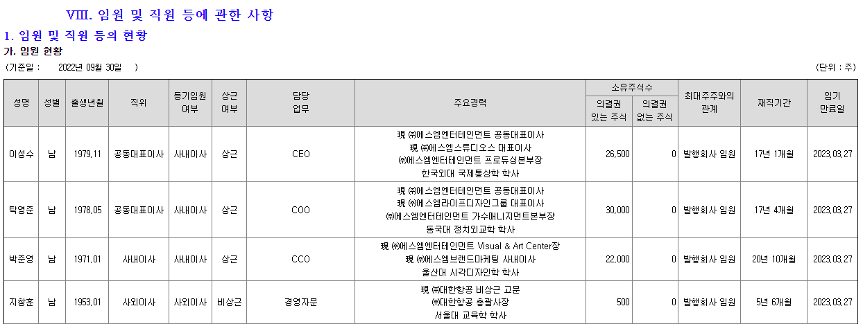 먼저 설명하기 전에 에스엠(SM)에 임원현황을 보셔야 합니다.