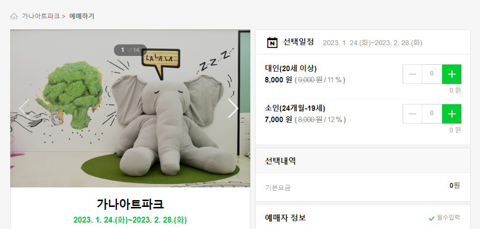 가나 아트파크는 공식적인 개인 기본요금은 9,000원이지만 네이버 부킹으로 예약을 하게 된다면 11%할인을 받아서 이용하실수 있습니다. 참고로 24개월 이하는 무료이지만 출생증명 필수지참이니 참고해주세요.