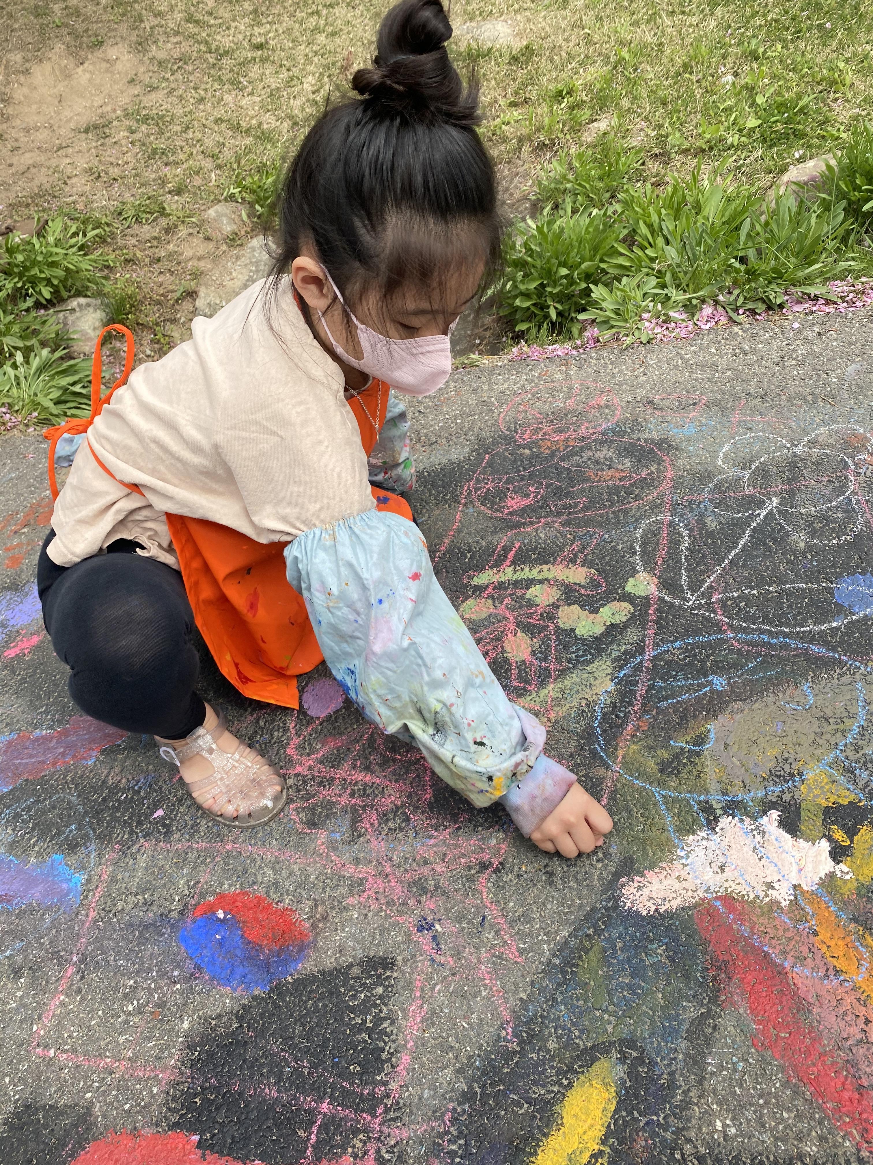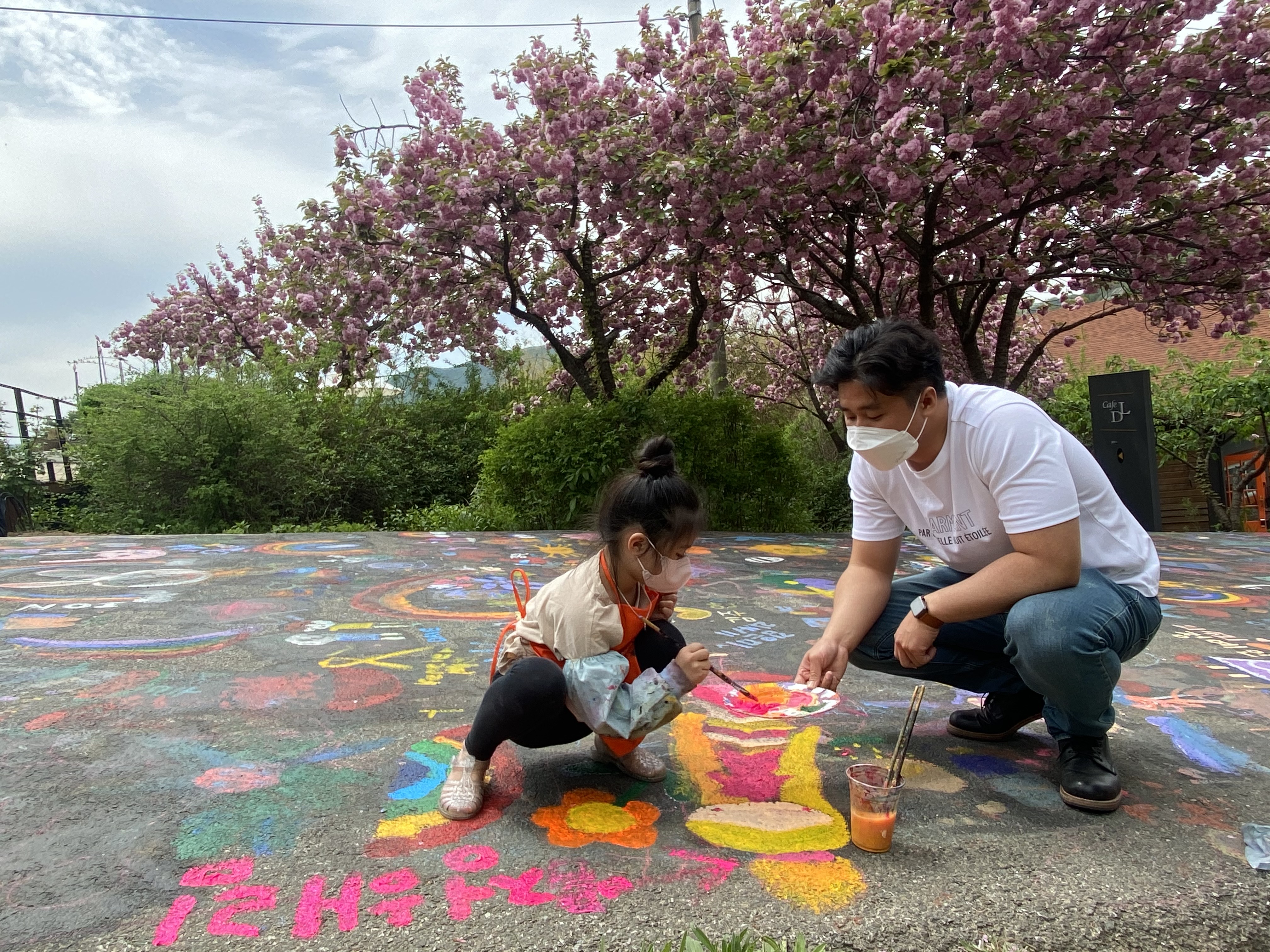 바닥화를 그리기 위해서는 앞치마와 팔토시를 받아서 착용하고 원하는 물감을 받아와야 합니다. 딸은 핑크색을 좋아해서 핑크물감을 많이 받아왔네요.