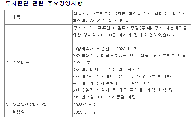 다올인베스트먼트 우리금융지주 매각 이슈 분석