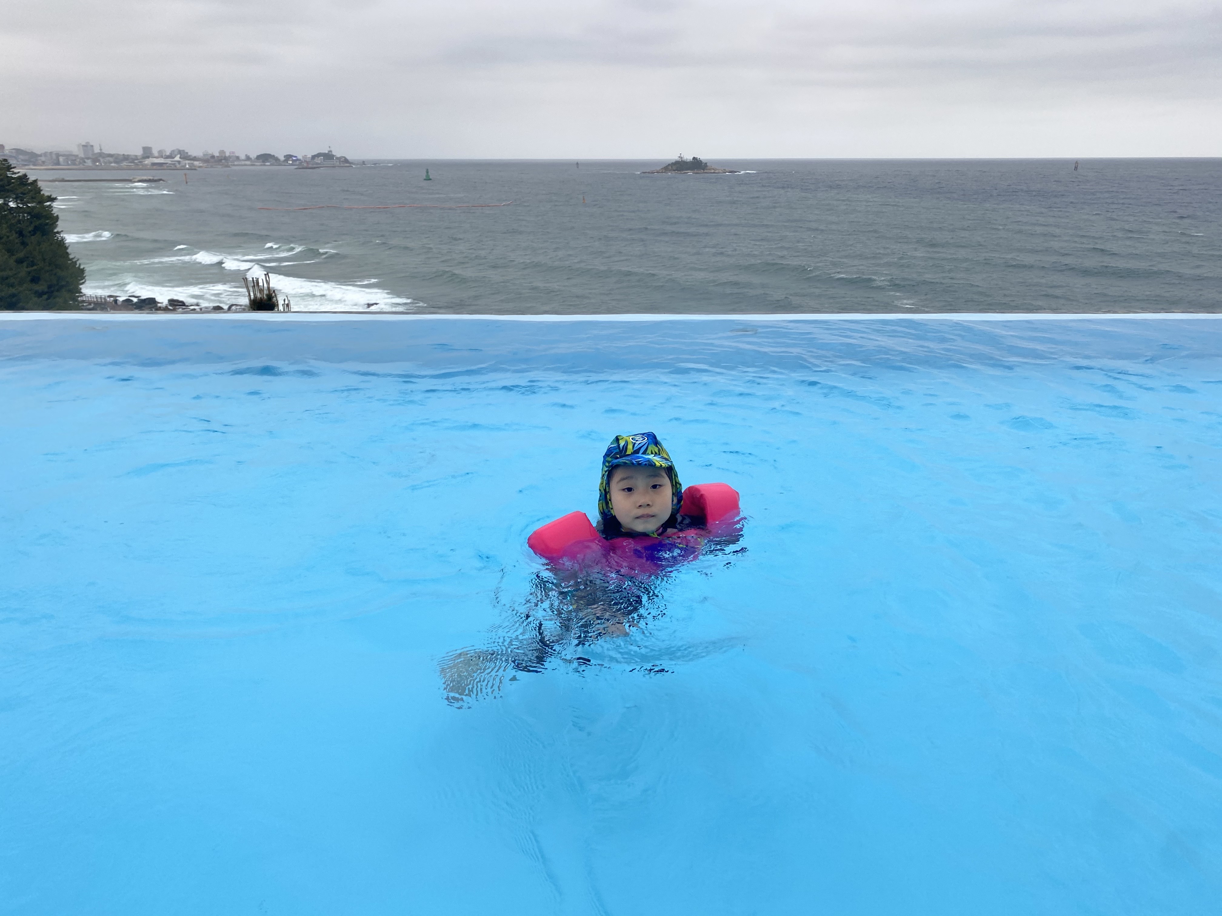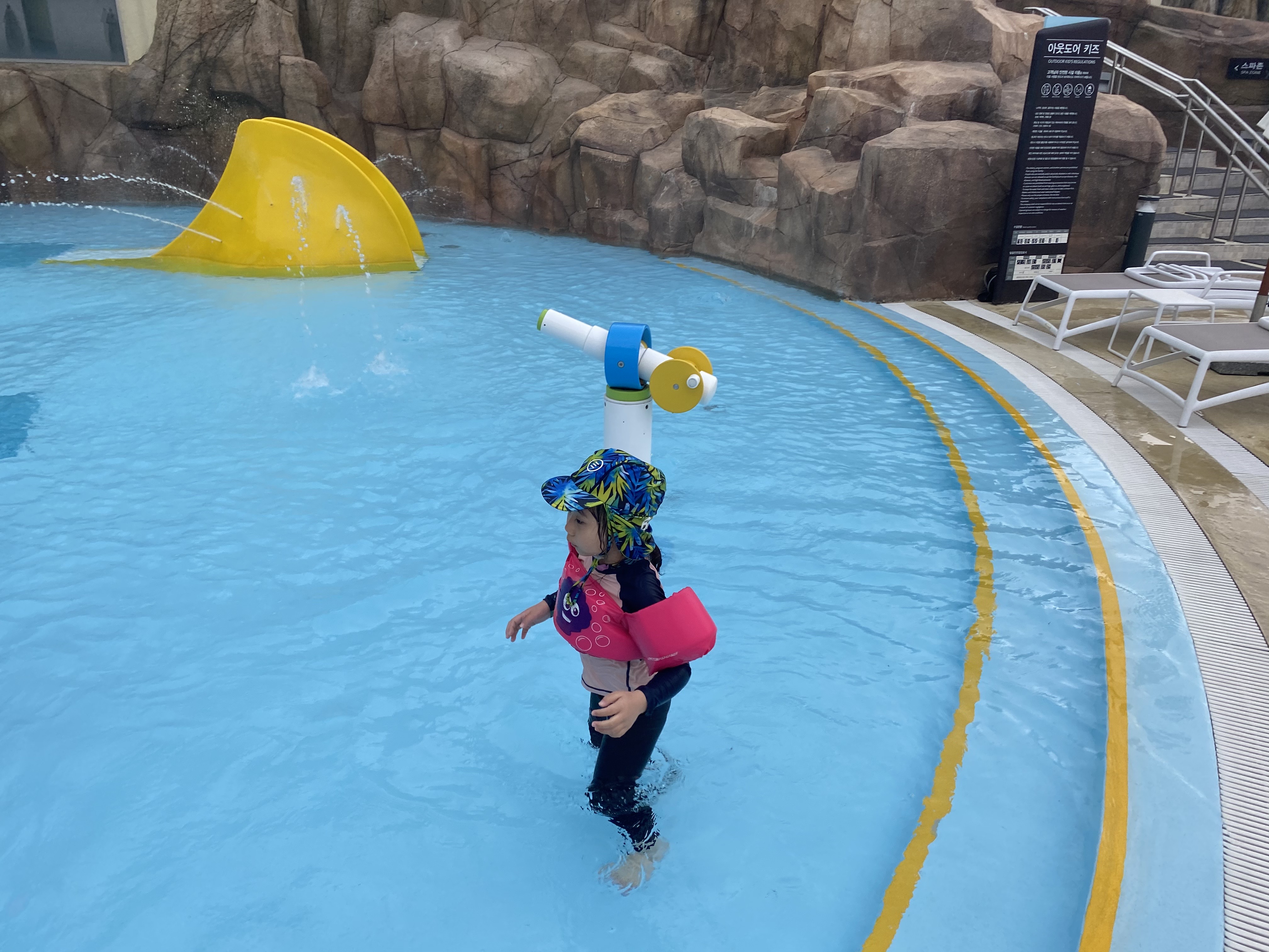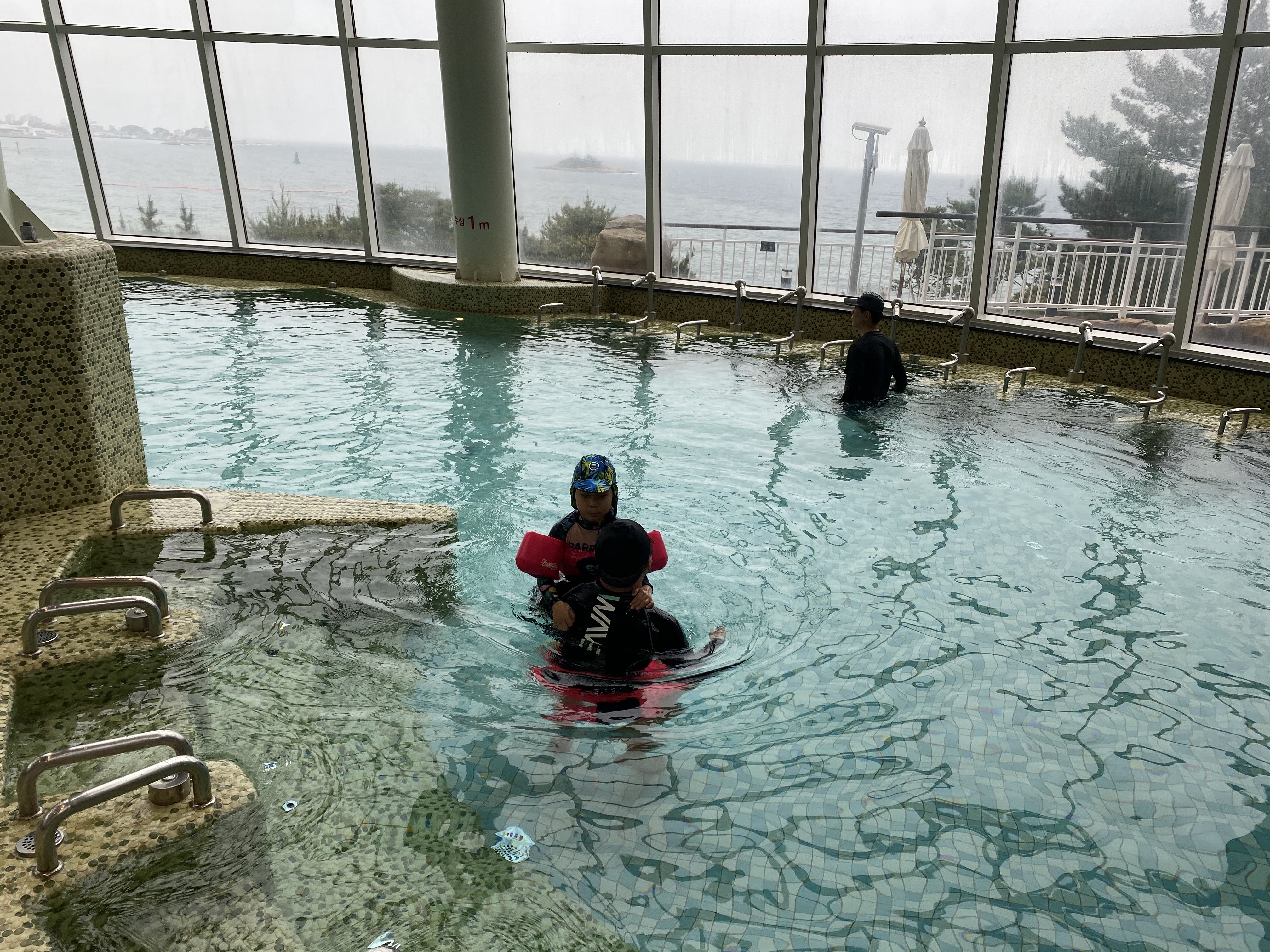 실외존에는 키즈풀과 인피니티 바데풀이 있습니다.바로 앞에 동해바다를 보면서 수영하니 마치 외국에 온 기분이 들지만 단점도 있었습니다. 바로 바닷바람에 추울 수 있다는 것입니다. 그럴 땐 바로 온수풀로 가서 몸을 녹이면서 쌓였던 피로를 풀어야 합니다.