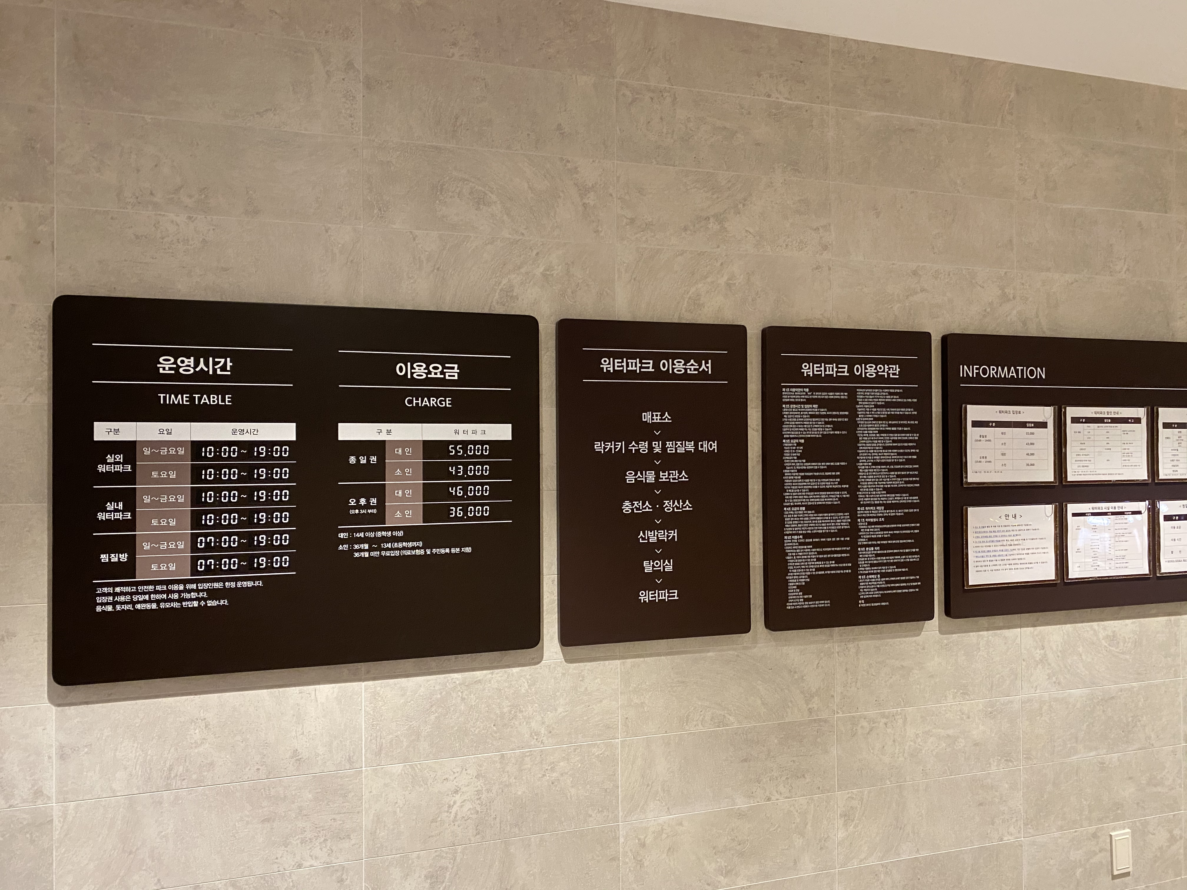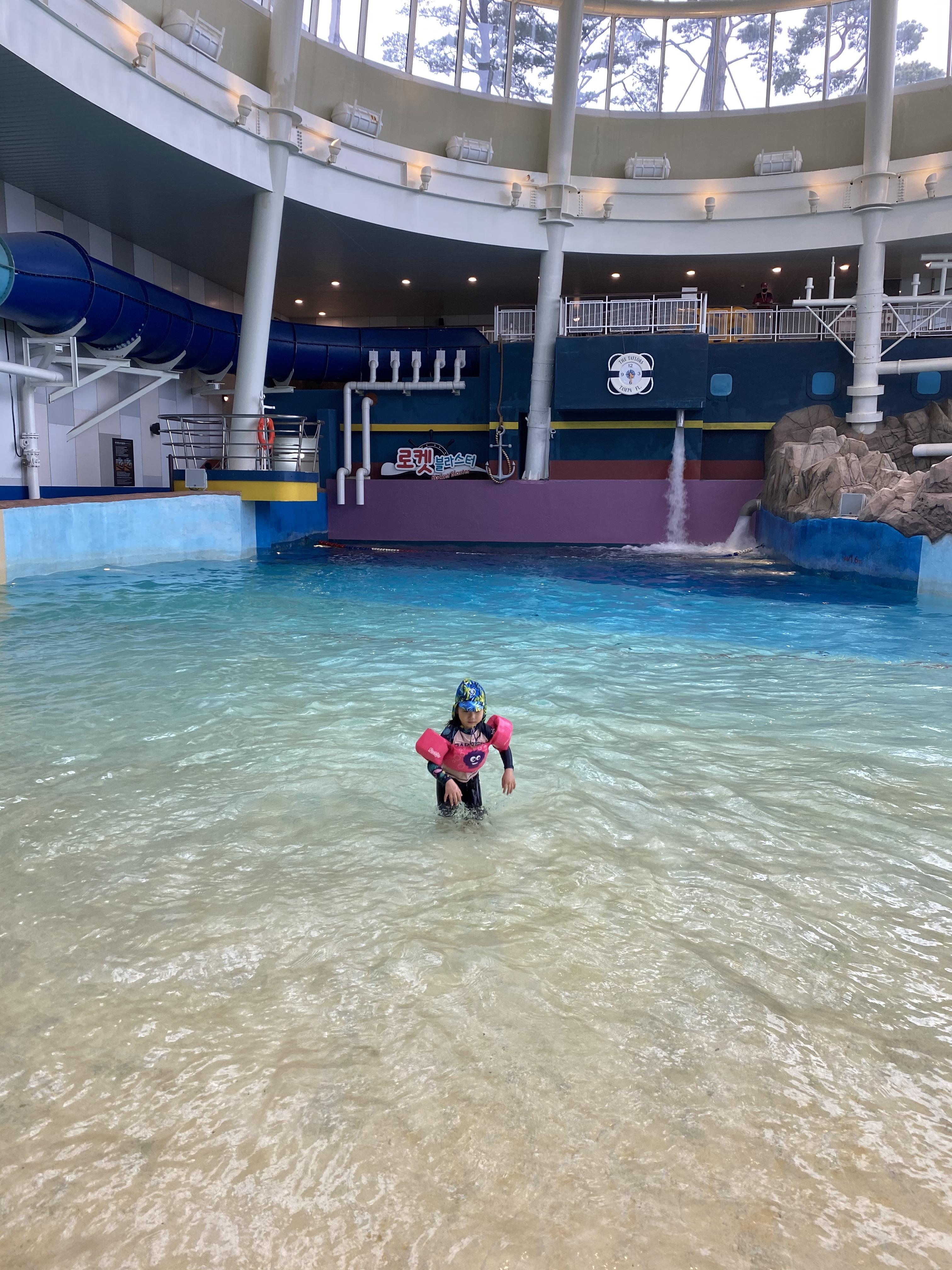 사람이 많이 없는 날에 갔는지 저희만 워터파크를 즐겼습니다. 실내존 파도풀은 최대수심 1.8이며, 구명조끼를 착용 후에 이용이 가능합니다. 그리고 수영모자는 필수이니 참고해 주세요.