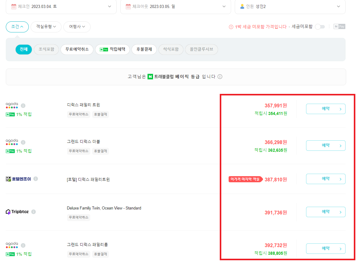 네이버 최저가 예매를 통해서 가격을 확인할 수 있습니다. 저희는 디럭스 패밀리 트윈 오션뷰를 예약을 해서 갔습니다. 속초 롯데리조트는 대부분의 객실의 오션뷰 때문에 좋은 거 같습니다.