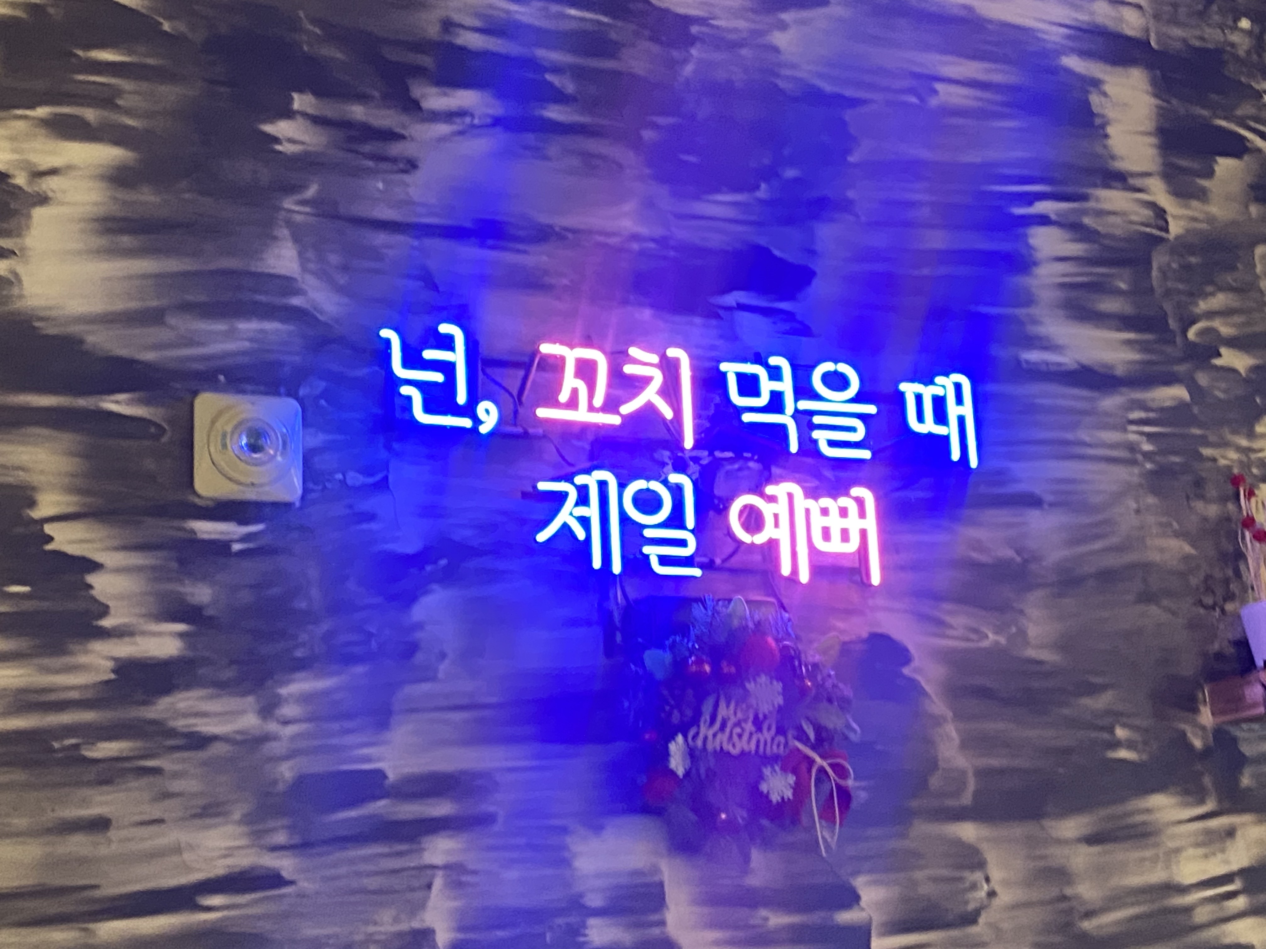 요즘 감성술집에는 이런 문구가 하나씩 있는 거 같습니다. 이곳에는 "넌, 꼬치 먹을 때 제일 예뻐"라는 문구가 있는데 저는 남자라 별로 와닿지는 않았네요.