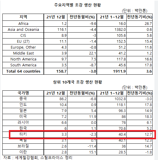 2021년 기준 튀르키예의 조강 생산은 전 세계 7위 규모의 4040만t입니다. 그렇게 되면서 터키향 철강 수출이 올해 일시적으로 크게 증가할 가능성을 나타내고 있습니다.