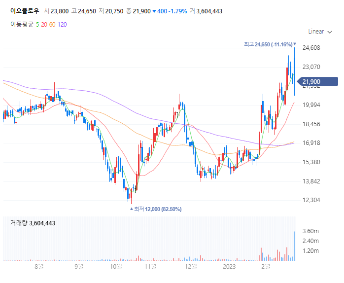 이오플로우 일봉차트를 보시면 2/22일 거래대금이 실린 음봉이 나왔습니다.