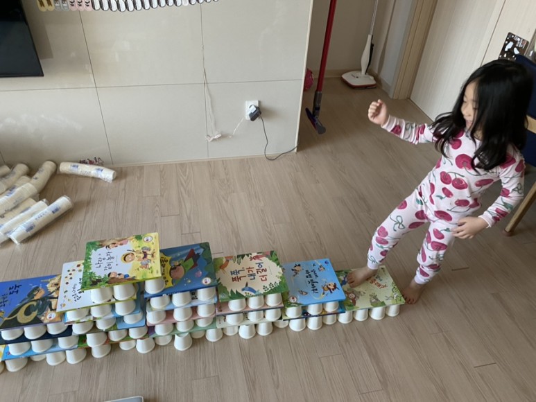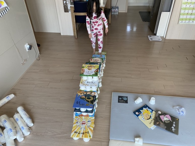 책과 종이컵을 이용해서 걸어다닐걸어 다닐 수 있는 계단을 만들 수 있습니다. 어른이 하면 무너지기 때문에 아이만 걸어 다닐 수 있습니다.