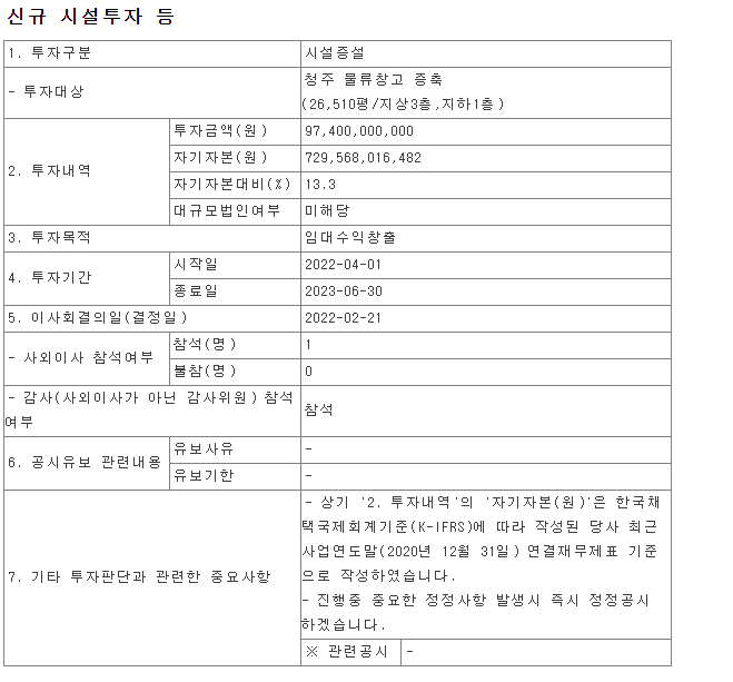청주에 물류창고 증축을 하여 임대수익창출을 한다고 공시하였습니다.