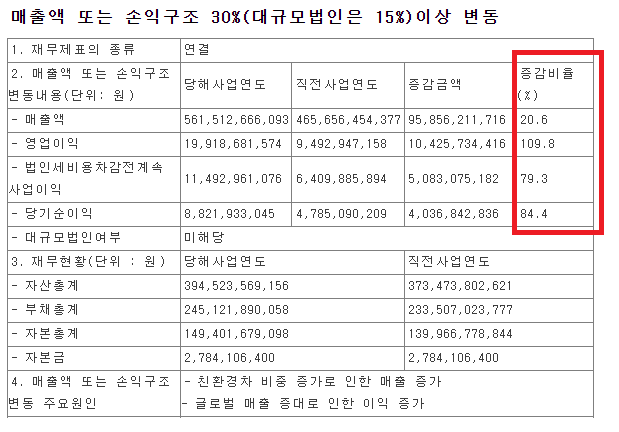 코리아에프티 실적공시를 보면 지난해 연결기준 영업이익이 199억원으로 전년대비 109.8% 정도 증가를 했으며, 매출액은 5615억 원으로 20.6% 늘어난것을 확인할 수 있습니다. 당기순이익 또한 88억 원으로 84.4% 증가를 했습니다.