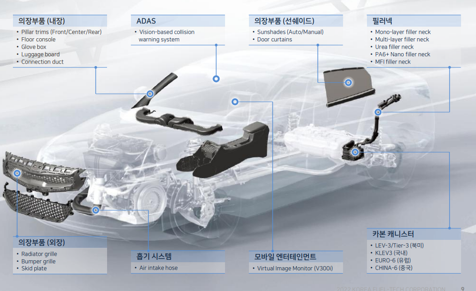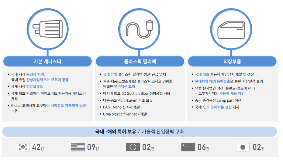 주력인 카본 캐니스터는 국내 시장에서는 독점적 지위에 있으며, 완성차업체 5개사의 모두 공급하고 있습니다. 세계 시장 점유율은 9% 정도입니다.