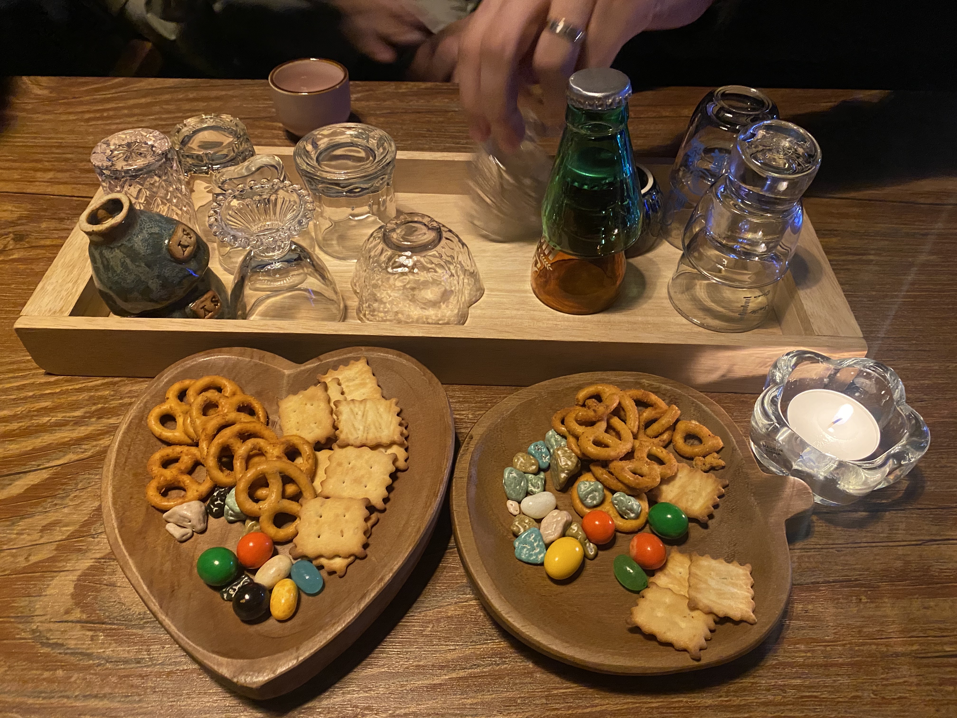 세븐데이즈 분위기도 그렇고 소주잔을 골라서 먹을 수 있어서 특별했습니다. 1차로 소주를 마시고 온 상태여서 소주잔을 잘못 고르면 많이 먹을 수 있기 때문에 작아 보이는 소주잔을 골랐습니다. 기본안주도 초콜릿과 과자가 제공이 됩니다.