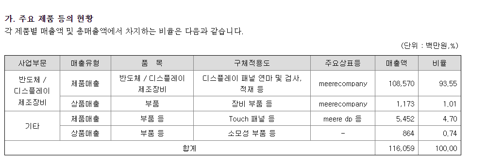 미래컴퍼니의 주요 제품 등의 현황을 보면 대부분의 매출이 디스플레이 패널 연마 및 검사, 적재등에서 약 93% 정도 비율로 발생하고 있는 것을 알 수 있습니다. 즉, 미래컴퍼니는 반도체 및 디스플레이 제조장비가 주력인 회사입니다.