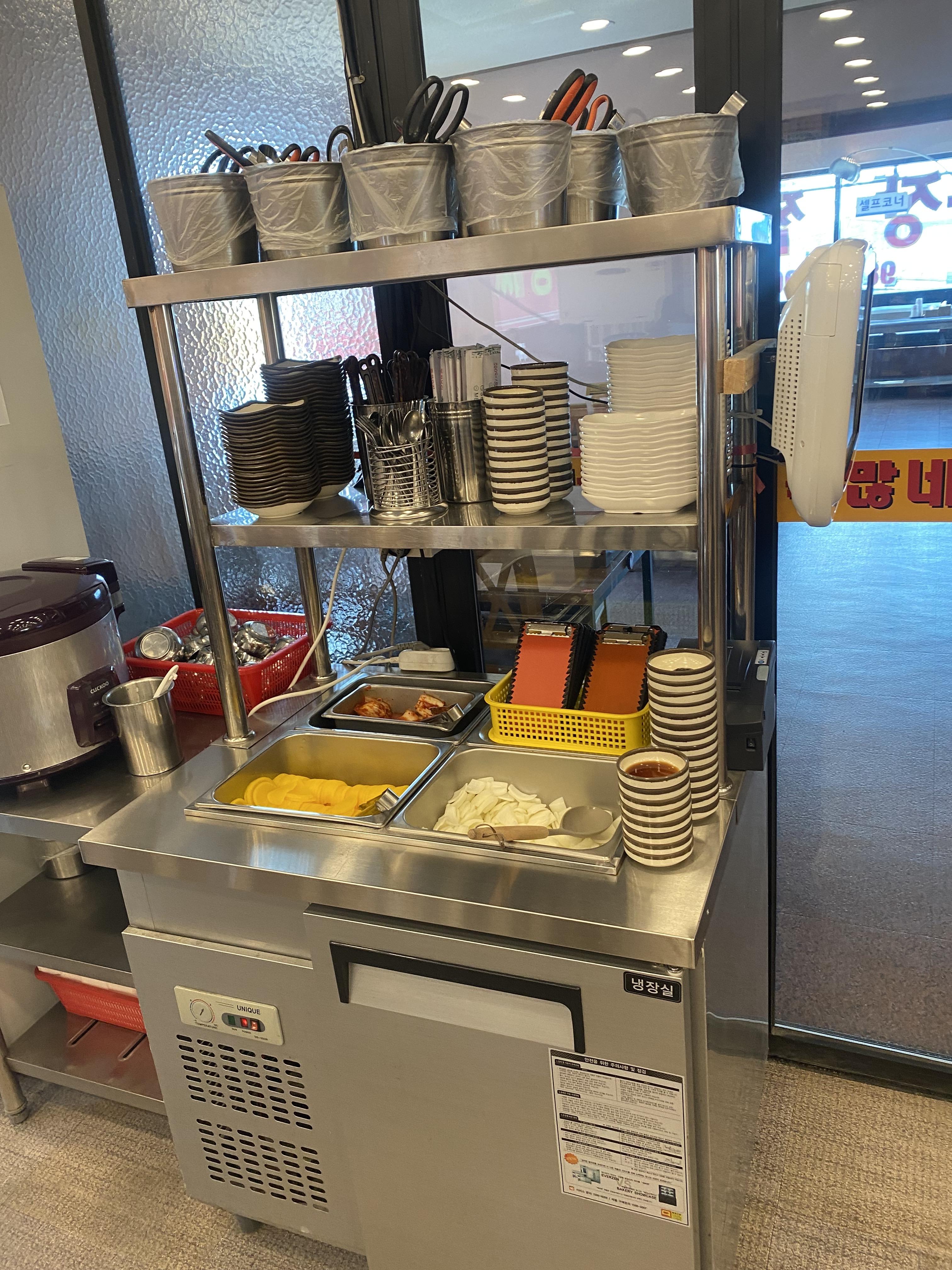 복많네 짬뽕을 소개하는 이유 중에 하나는 바로 공기밥 무한리필이라는 점입니다. 짬뽕국물에 자신이 있기 때문에 공기밥을 말아 드시라고 서비스로 제공되는 거 같습니다. 셀프바에는 양파, 단무지, 김치, 밥, 식기류가 제공되어 있습니다.