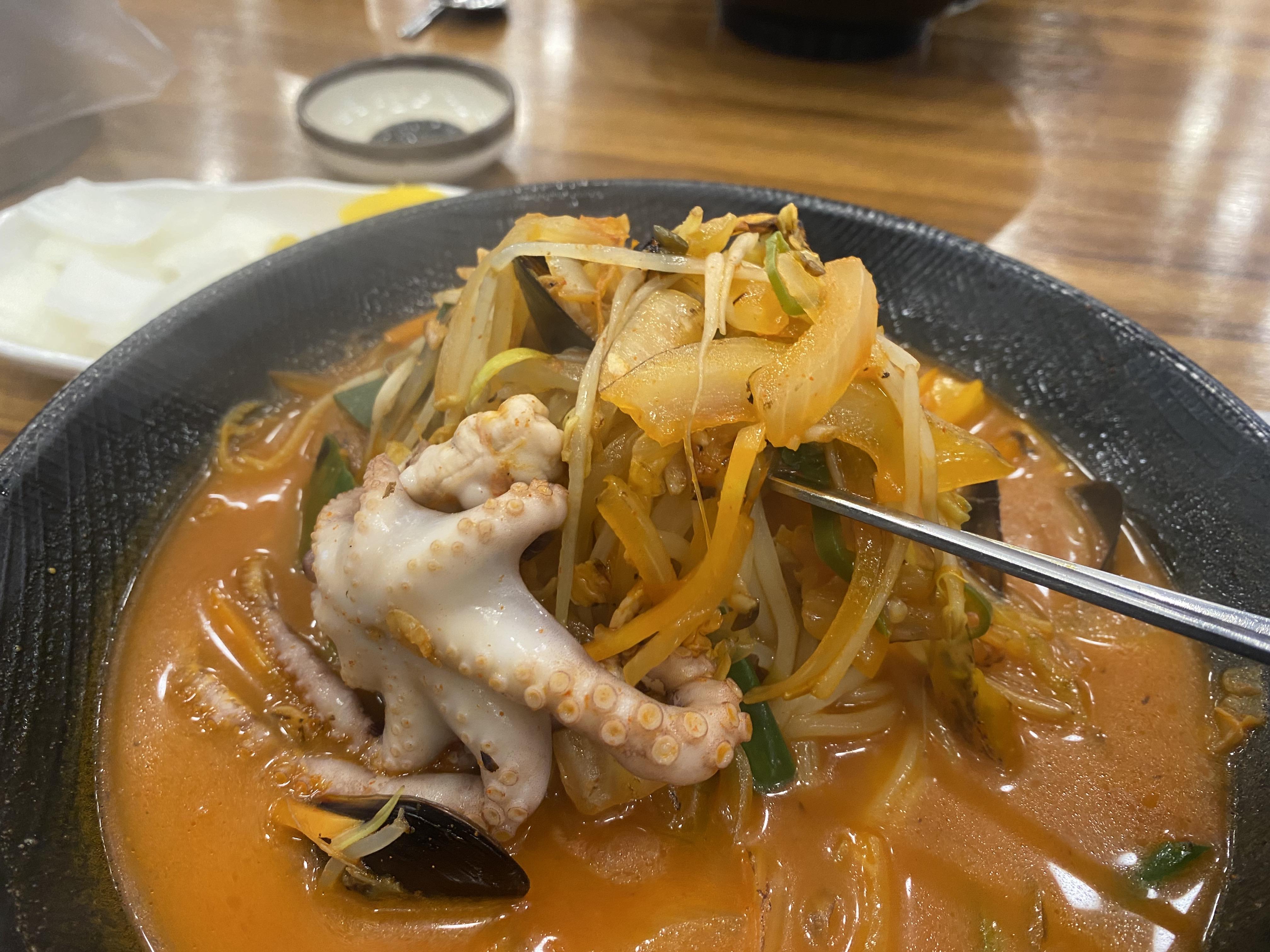 복많네 짬뽕 비주얼은 쭈꾸미 한 마리가 통째로 들어가기 때문에 엄청 맛있어 보입니다. 홍합도 딱 적당히 들어가고, 각종 채소와 면이 들어있습니다.