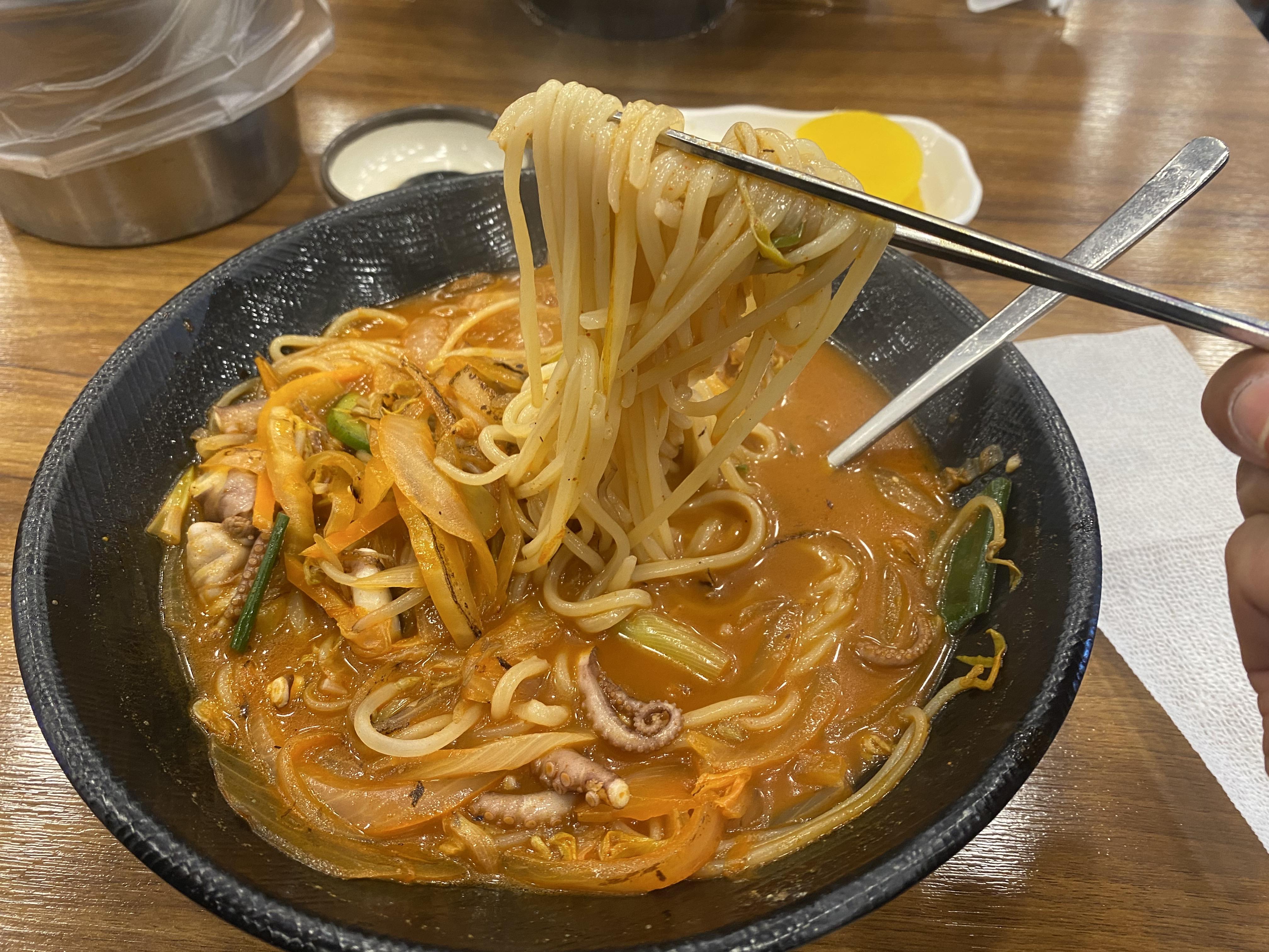 집게와 가위로 쭈꾸미 한 마리를 먹기 좋게 자르고 짬뽕을 먹으면 됩니다. 면발도 국물과 잘 흡수되어서 후루룩 먹으면 멈추지를 못합니다.