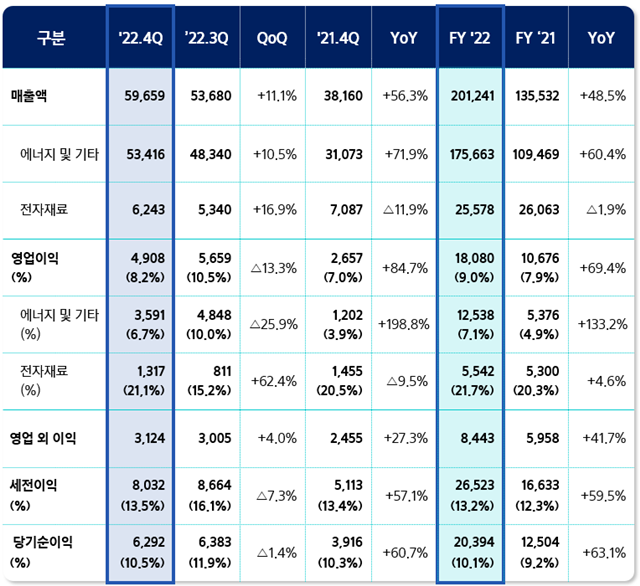 에너지 부문 매출은 5조 3,416억 원으로 전년 동기 대비 71.9%, 전분기 대비 10.5% 증가했다. 영업이익은 3,591억 원으로 전년 동기 대비 198.8% 증가했고, 전분기 대비 25.9% 감소했다.