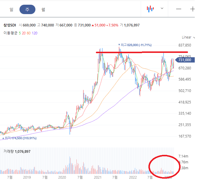 삼성SDI는 대형주로 무거운 종목이므로 장기적인 관점에서 봐야 합니다. 주봉 차트를 보시면 거래대금이 부족한 모습이 상당히 아쉬운 모습입니다. 위에 저항대를 뚫지 못하는 모습을 보고 있으므로 거래대금을 동반한 장대양봉이 필요해 보입니다. 지지부진하게 횡보를 하다 보면 하락할 가능성이 있어 보입니다.