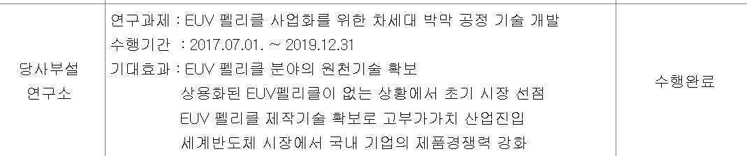 에스앤에스텍 사업보고서 연구개발활동에 따르면 연구과제인 EUV 펠리클 사업화를 위한 차세대 박막 공정 기술개발을 수행을 완료한 것으로 나와있습니다.