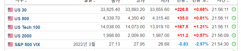 현재 22:00 미국 지수선물은 상승을 하고 있는 상황입니다.