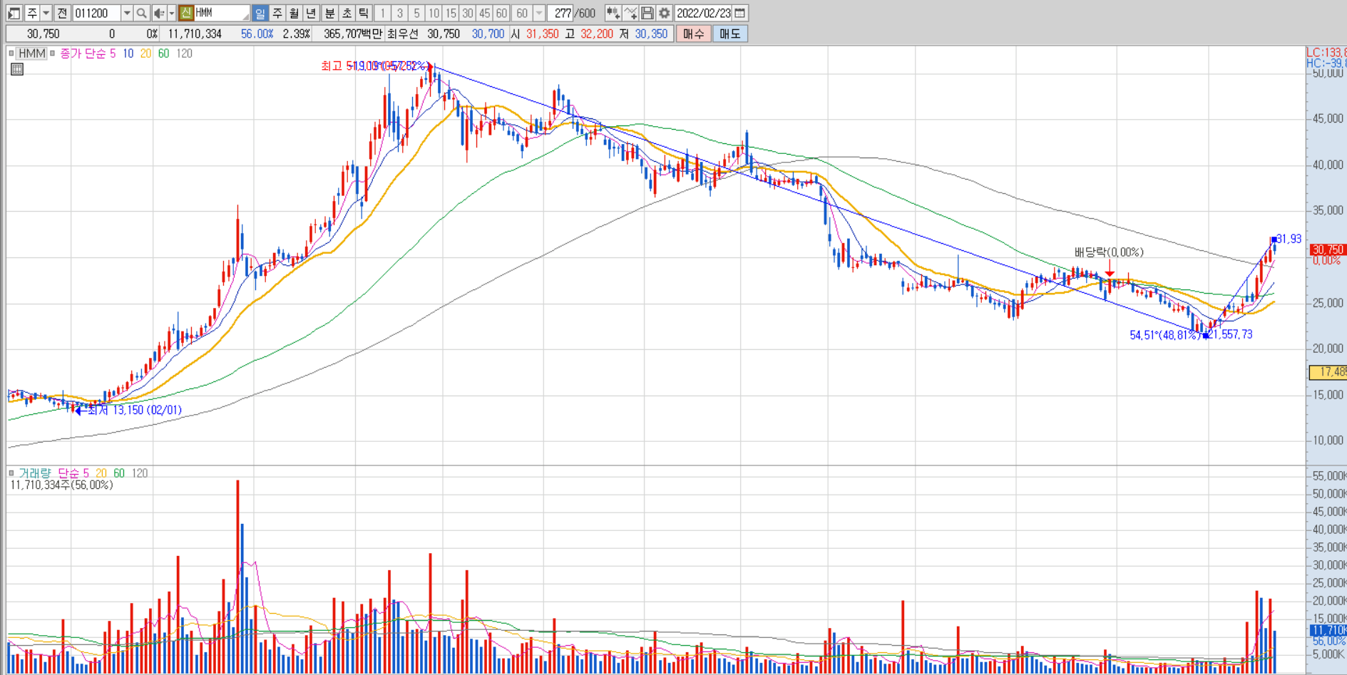 대표적인 해운주로 HMM이 있는데 작년에 '흠슬라'로 불리며 굉장히 많은 관심을 받았던 주식입니다.