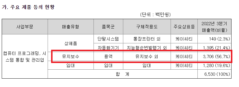 케이씨티는 56%의 매출이 유지보수에서 발생하고 있는것으로 나타나고 있습니다.