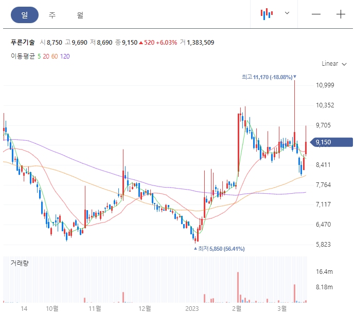 푸른기술 일봉차트를 보시면 최근 거래대금과 함게 피뢰침을 맞은적이 있지만 다시 회복하는 모습을 보여주고 있습니다.