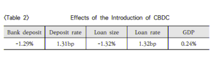 구체적으로는 CBDC가 도입될 경우 예금이자율은 1.31bp 증가하였고 기업대출규모는 1.32%감소하는 효과가 있습니다. 이러한 기업투자의 감소는 기업의 생산감소로 이어지지만 CBDC 도입으로 온라인 거래 규모가 8.2% 증가하면서 CBDC 도입은 국가 경제 전체적으로 0.24% 총생산 증가 효과를 가져옵니다.